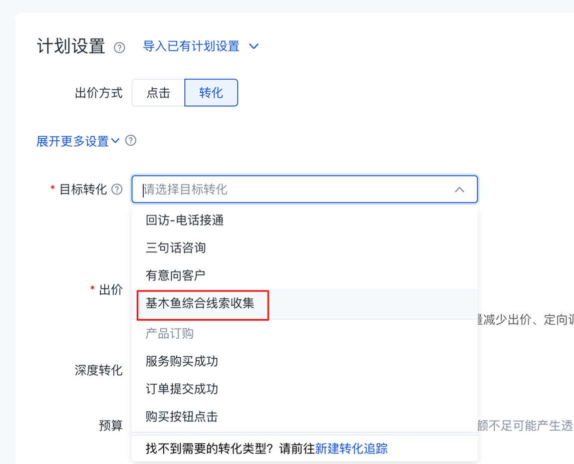 Step 2:新建推廣計劃/oCPC出價策略時,「不限」數據源下“目標轉化”選擇「基木魚綜合線索收集」;