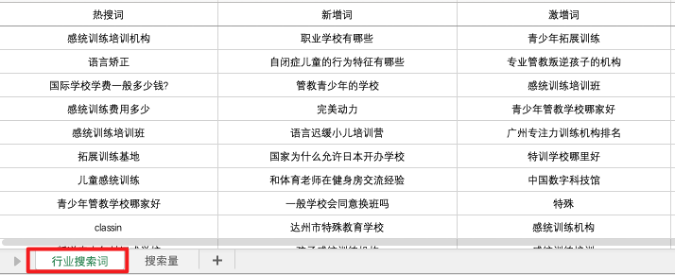 sheet1-行業(yè)搜索詞:表格形式呈現(xiàn)熱搜詞、新增詞、激增詞,便于分析及后續(xù)數(shù)據(jù)加工應(yīng)用