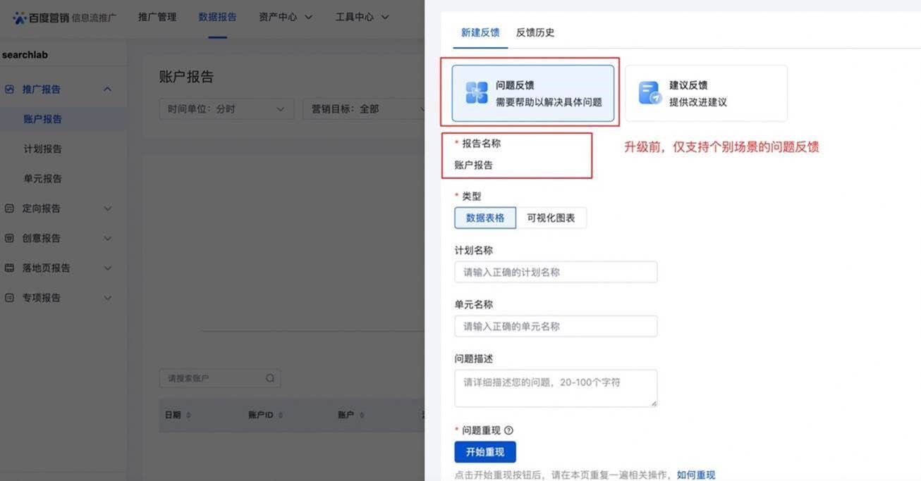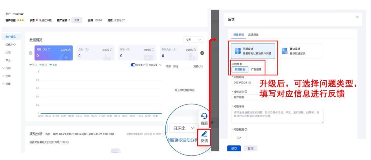 為了及時(shí)和更好地了解客戶在廣告投放和優(yōu)化過程中遭遇的問題和感受體驗(yàn)、不斷提高服務(wù)質(zhì)量,百度廣告投放平臺持續(xù)升級增強(qiáng)客戶的即時(shí)『反饋』能力。目前,信息流廣告投放平臺的全部頁面已增加了通用建議反饋入口。而客戶和優(yōu)化師在日常使用廣告投放平臺過程中會遇到操作搭建、數(shù)據(jù)查看等相關(guān)問題,需要快速便捷的反饋問題,特此本次反饋功能持續(xù)升級,將廣告搭建、數(shù)據(jù)報(bào)告兩類問題類型的問題反饋入口覆蓋到信息流廣告投放平臺的全部頁面,以便于客戶和優(yōu)化師隨時(shí)進(jìn)行問題反饋。
