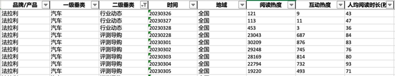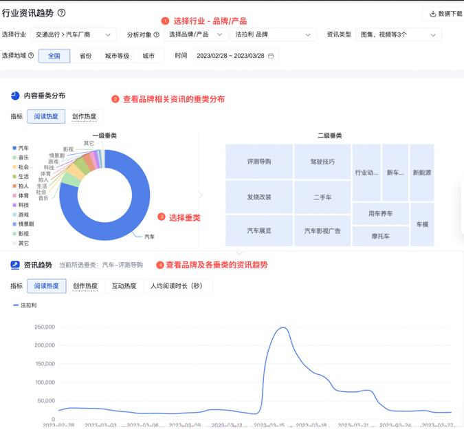2)查看品牌相關資訊的垂類分布:支持計算不同垂類的閱讀熱度、創(chuàng)作熱度分布。