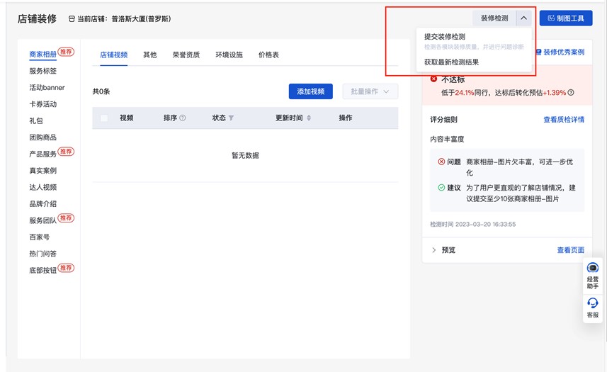 當前店鋪質量評級主要以“店鋪頁內容填充率”作為衡量指標,如商家相冊圖片/視頻數量、商品/產品數量等。本次店鋪質量評級規則全面升級,針對不同店鋪類目擬定不同評估規則,同時新增對于店鋪頁“內容質量”的評估。為了提高裝修效率,本次還上線了“裝修檢測功能”,在裝修時可顯示引導和提示,幫助客戶快速定位問題,提升店鋪頁質量。