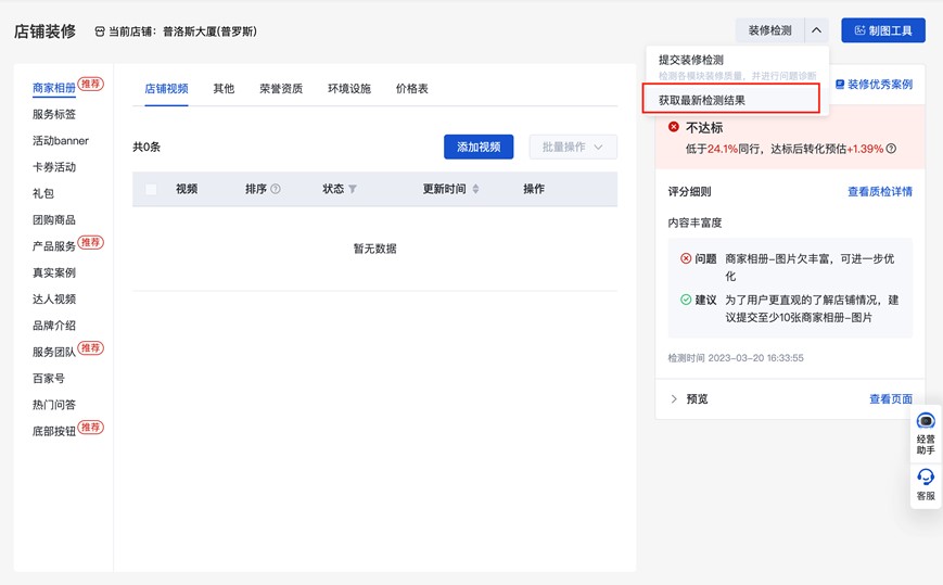- 增加【裝修檢測】功能,對頁面各模塊裝修效果進行檢測,并給出裝修診斷及優化建議