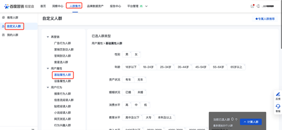 a)入口:觀星盤>人群集市>自定義人群>用戶屬性>基礎屬性人群