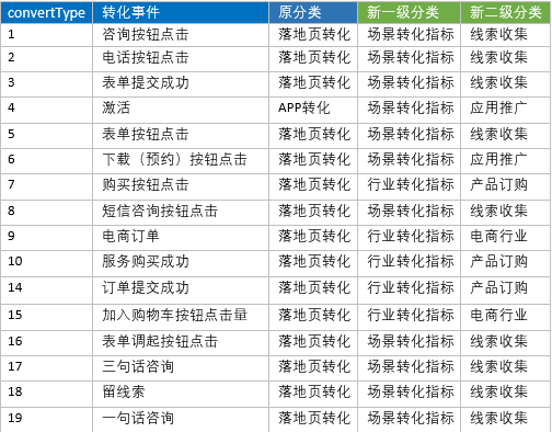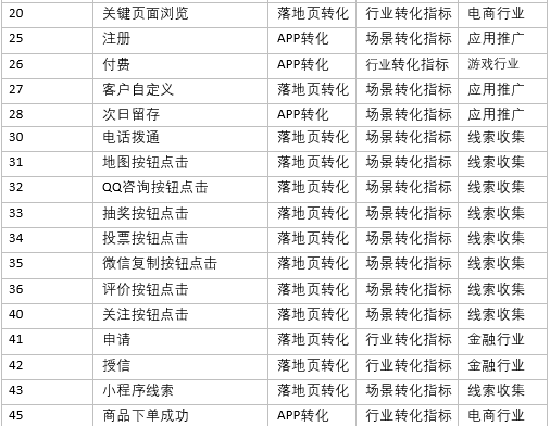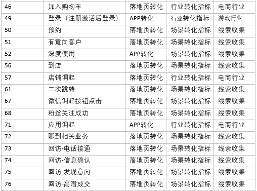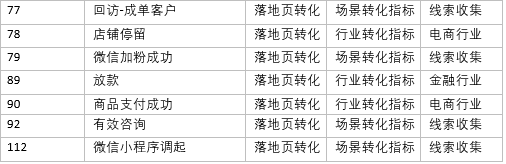 轉化指標根據適用行業、場景進行了重新劃分,將單個行業特有的指標劃分到行業類別中(如「授信」僅金融行業投放,因此劃分到金融行業),將多個行業普遍適用的指標劃分到場景類別中(如「表單提交」在教育、房產、生活服務等均有應用,因此劃分到線索收集場景),具體的指標劃分明細如下: