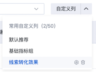 → 選擇常用自定義列:“自定義列”按鈕新增下拉選項,默認選中“默認推薦”模板;當存在其他常用自定義列模板時,點擊名稱可以直接將其中保存的字段應用至下方數據表格中。如下圖所示: