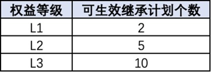 對于優質老賬戶,繼承權益會于每月1號進行更新,截止當月最后末日,繼承權益不會根據實時投放情況調整。該類賬戶繼承權以將分為3檔,不同檔位對應計劃生效個數如下: