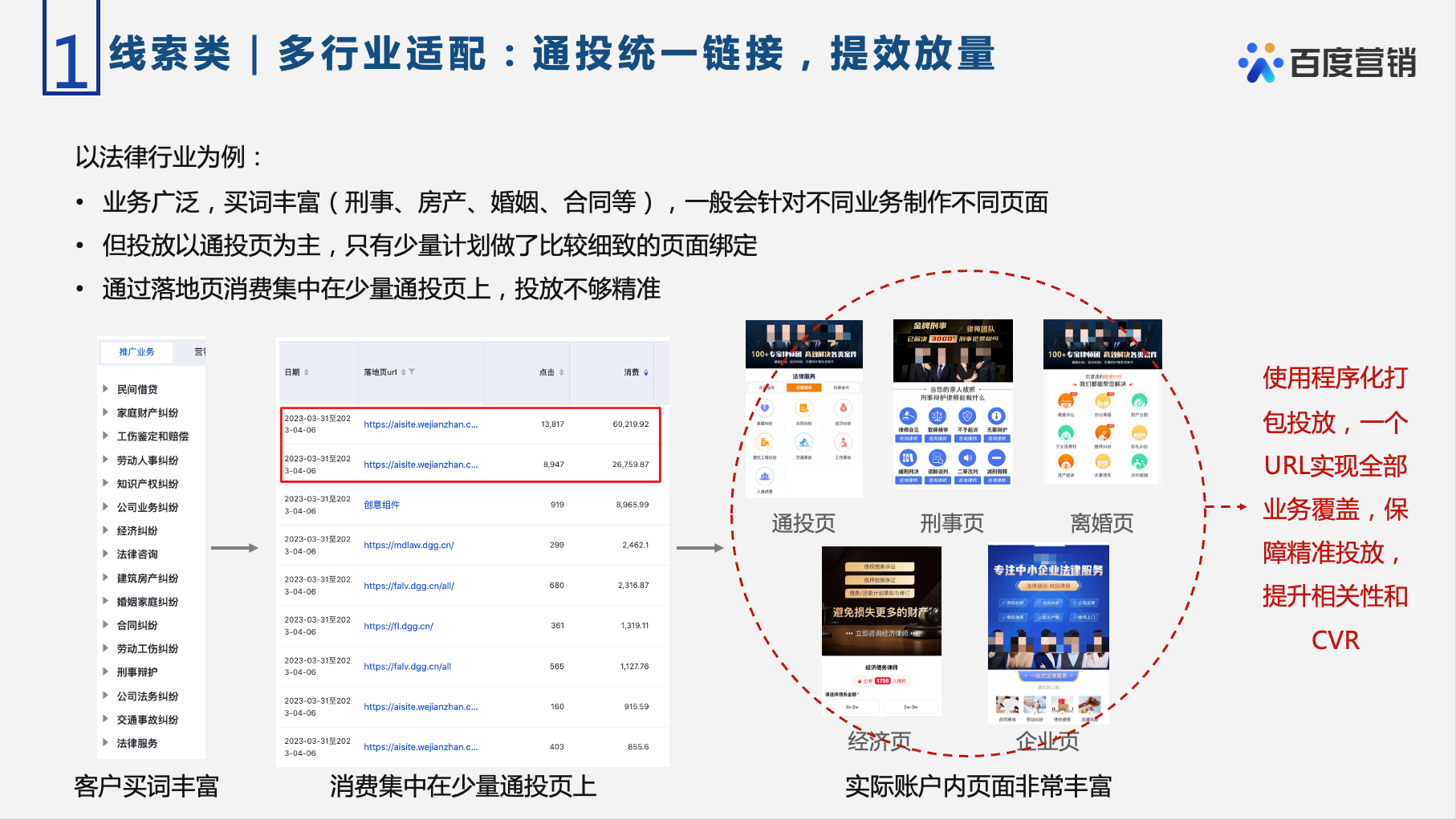 - 線索類客戶效果:某法律客戶業(yè)務(wù)點(diǎn)繁多,基木魚內(nèi)容庫物料&落地頁豐富,但沒有能力有效利用,導(dǎo)致賬戶獲量低、線索質(zhì)量差,通過使用程序化優(yōu)選能力,配合深轉(zhuǎn)目標(biāo)優(yōu)化,達(dá)成展現(xiàn)量+95%,線索量+65%,線索有效性+17%,在同地區(qū)客戶獲量低的情況下,此客戶依然保持穩(wěn)定投放。
