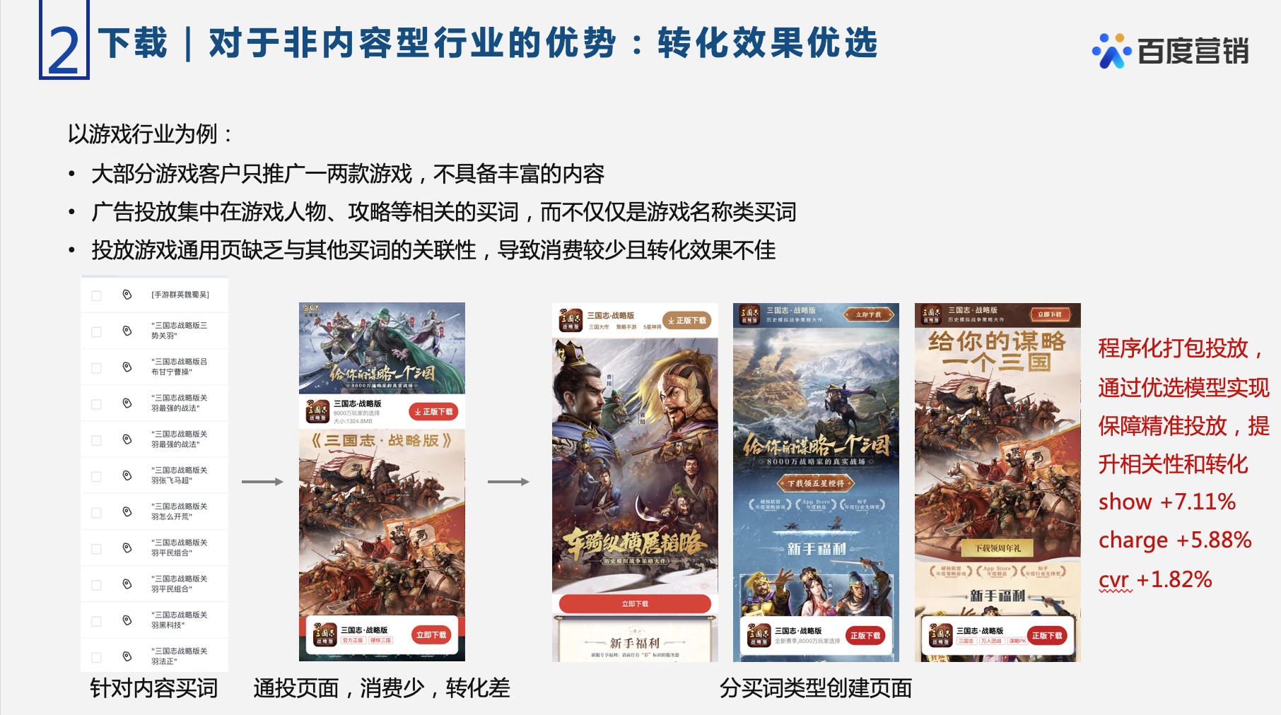 - 下載類客戶效果:同時(shí)適配于內(nèi)容型客戶品牌詞部分&非內(nèi)容型客戶所有投放業(yè)務(wù)。某旅游平臺客戶投放機(jī)票類通用詞,分機(jī)票新客、低價(jià)機(jī)票、定制包機(jī)、航班動態(tài)等主題制作營銷頁,依賴程序化CVR優(yōu)選能力投放,下載量+8%