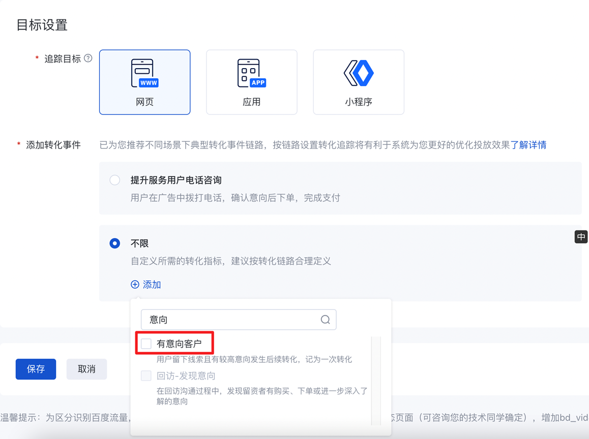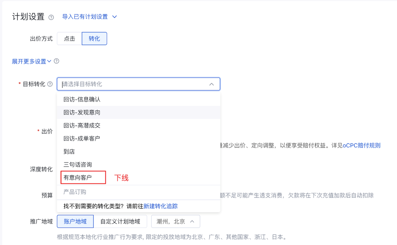 ? 搜索推廣-推廣管理 -新建計劃:目標轉化可選項目中不再提供【有意向客戶】選項