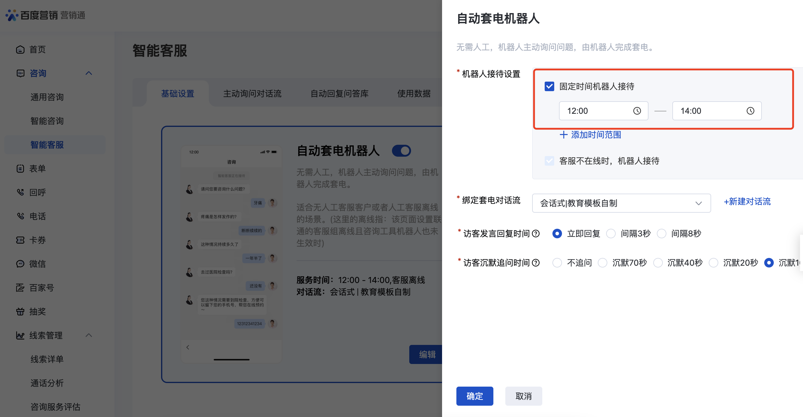 2023年6月1日起執(zhí)行,每周更新名單,智能客服托管接待后,人工客服無法聯(lián)通,需自行在營(yíng)銷通-咨詢-智能客服-自動(dòng)套電機(jī)器人-設(shè)置機(jī)器人接待時(shí)間或取消勾選
