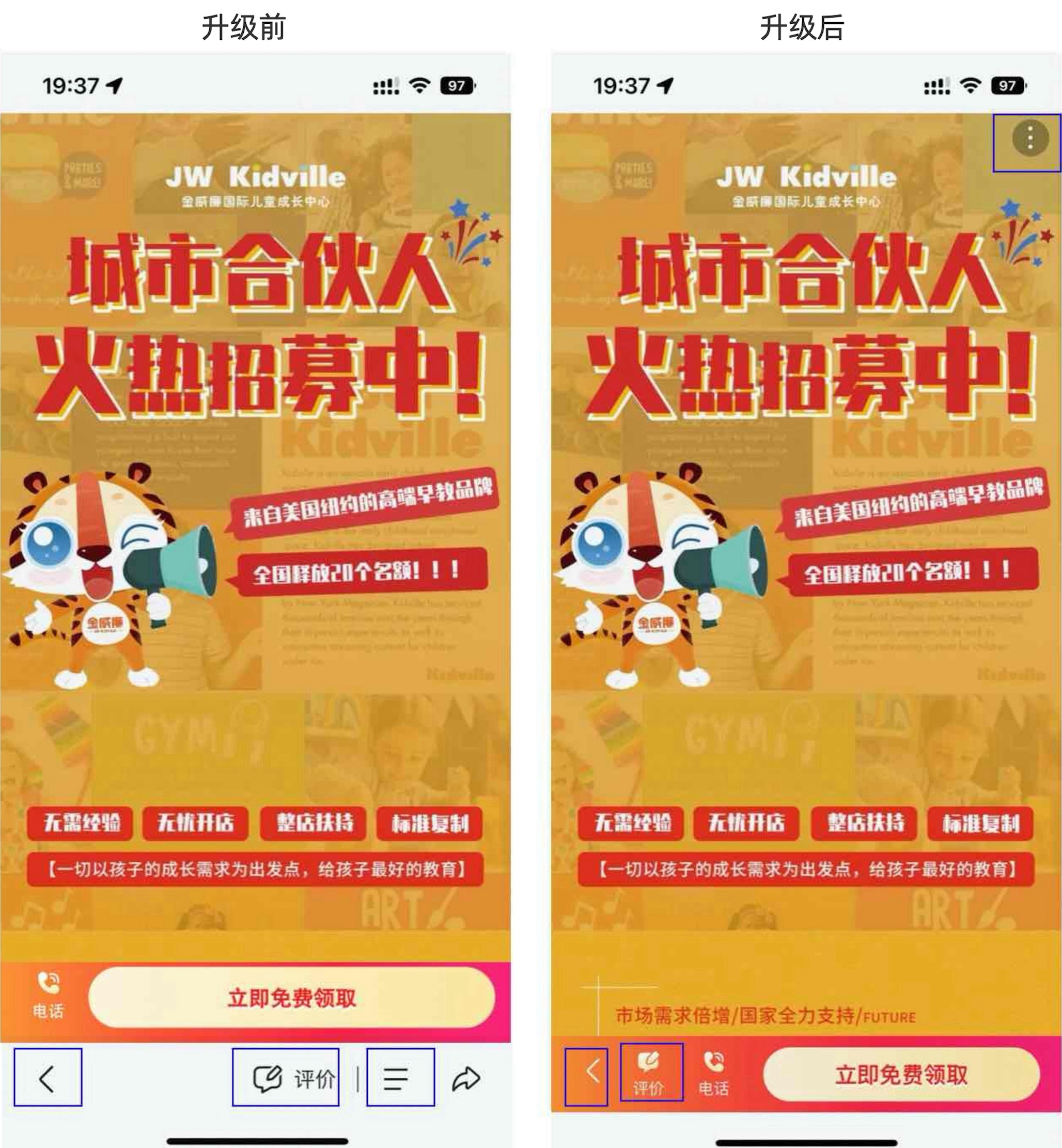 針對使用「營銷組件」-「線索轉化」-「底部懸浮」樣式1、2、4的新增及存量營銷頁面,設置不超過3類轉化類型時,在百度APP打開落地頁,底bar上原有的返回、評價及更多菜單遷移至營銷頁展示: