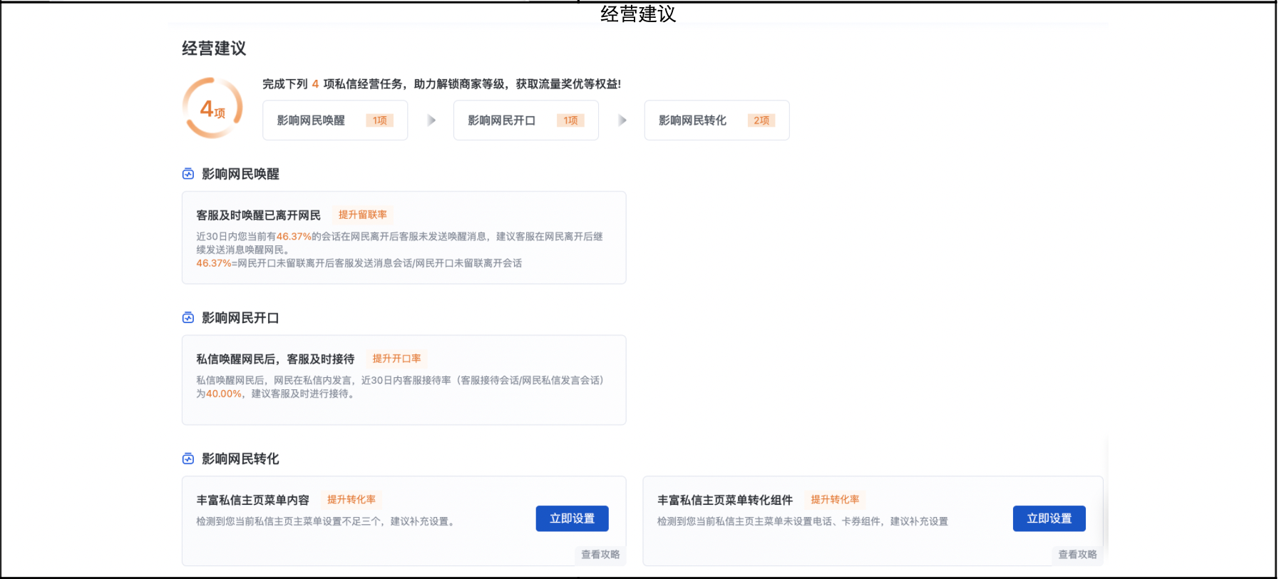 ●經營數據:設置的喚醒任務觸達情況、轉化情況、菜單欄的轉化情況、客服在私信場景的引導情況,了解目前在挽回線索上系統喚醒任務和客服的觸達情況