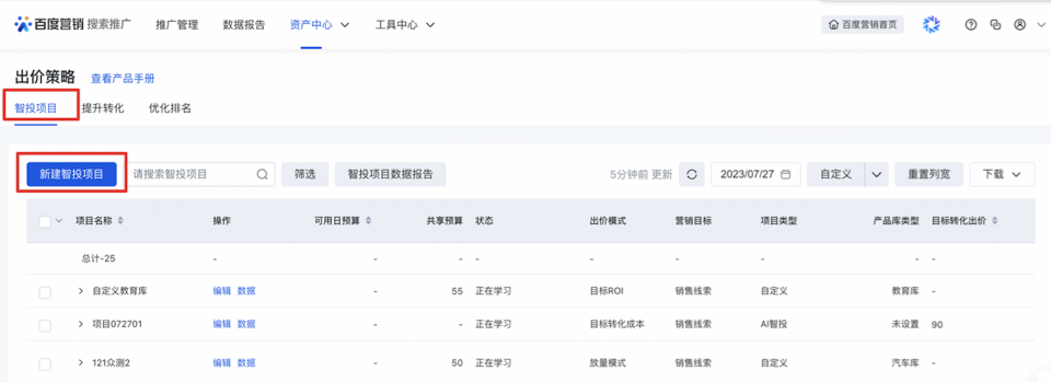 Step1:在『資產中心』的『出價策略』中選擇『智投項目』,點擊『新建智投項目』后可進入新建項目頁面。