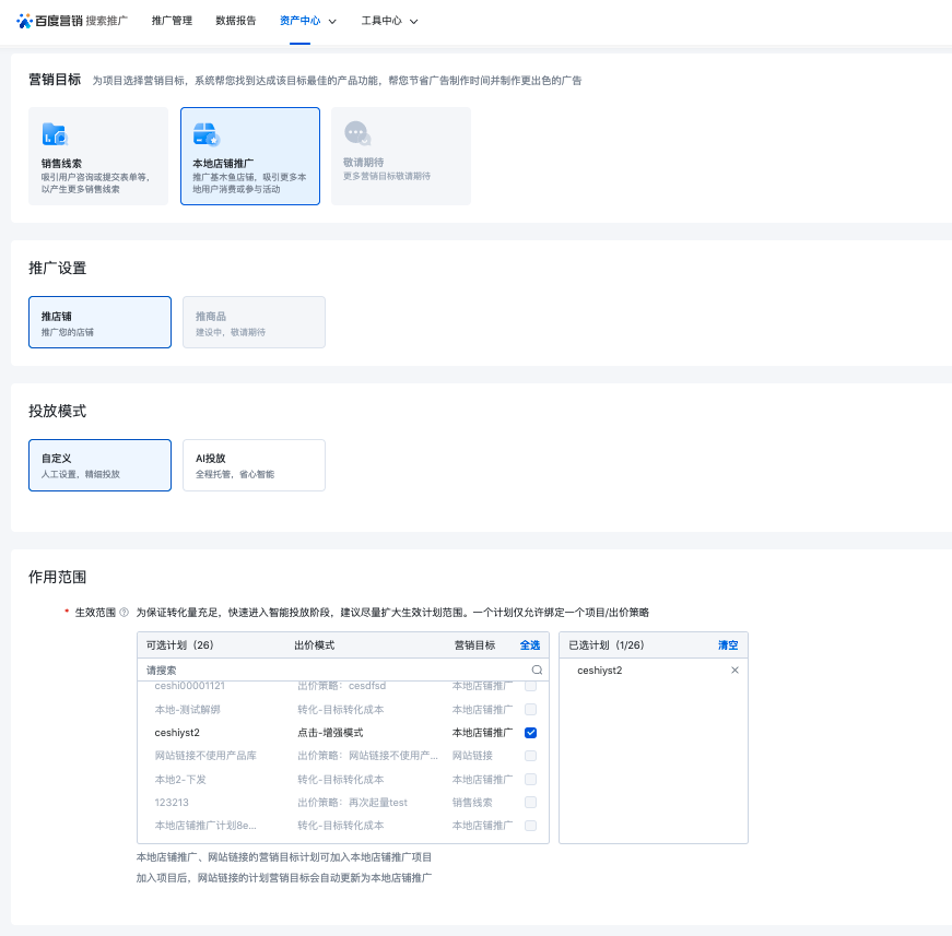 請注意,智投項目是oCPC出價策略的升級版本,計劃加入智投項目后,“自定義”投放模式下的投放效果,和使用oCPC出價策略完全一致,但您可以在智投項目上進一步選用推廣場景、開啟“AI投放”等高級能力,實現更好的轉化效果。后續搜索推廣投放平臺將繼續智投項目的權益和能力,本次升級僅為投放平臺智投項目新增「本地店鋪推廣」營銷目標功能上線,不影響賬戶現有投放中的計劃的正常投放效果。