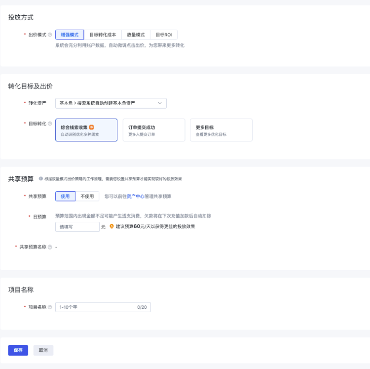 注意:一個計劃僅支持綁定一個出價策略『提升轉化』或『智投項目』