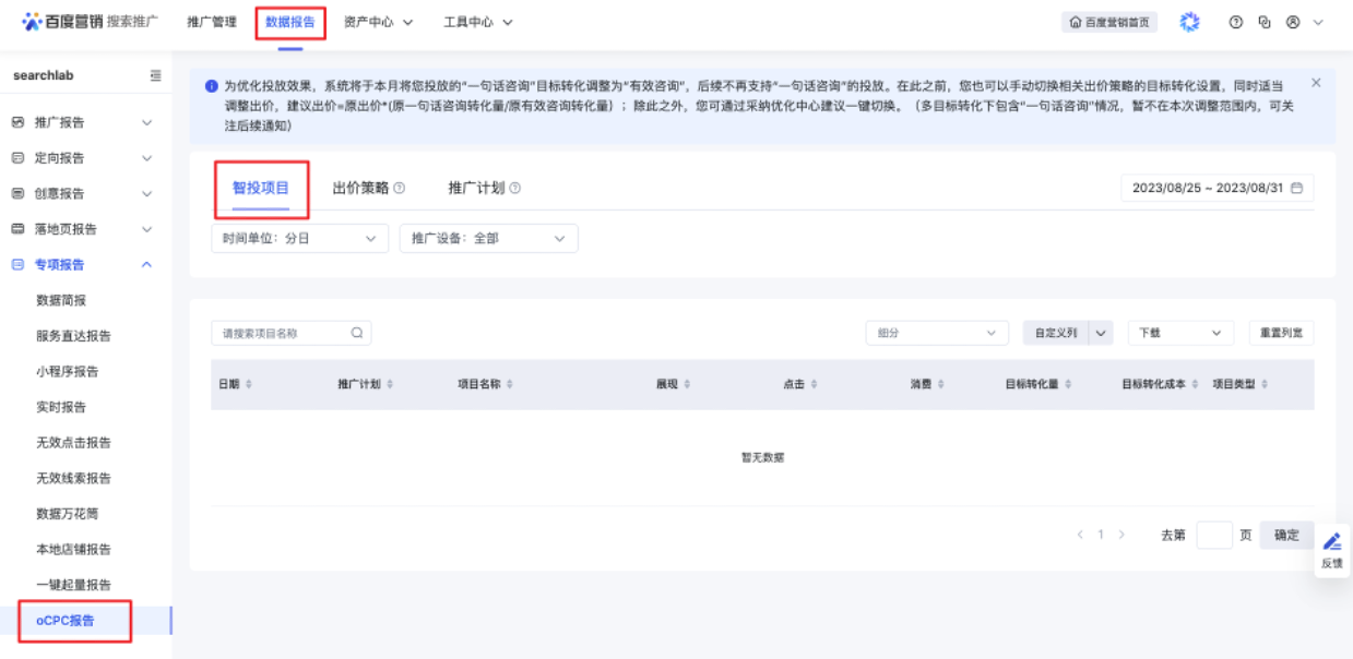 查詢路徑:數據報告->專項報告->oCPC報告->智投項目