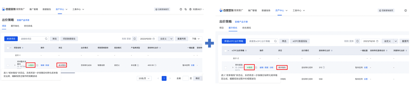 在效果廣告投放領(lǐng)域,一直以來(lái)營(yíng)銷(xiāo)者追求的核心目標(biāo)是在成本穩(wěn)定可控的前提下,獲得盡可能多的有效轉(zhuǎn)化。然而,成本穩(wěn)定性問(wèn)題一直是效果優(yōu)化經(jīng)常面臨的主要難題,也是客訴中排名TOP 3的問(wèn)題類(lèi)型。今年以來(lái)百度搜索oCPC智能化投放策略能力的不斷升級(jí),AI賦能的智能化投放,可以更好利用客戶(hù)的轉(zhuǎn)化全鏈路數(shù)據(jù),幫助客戶(hù)在成本穩(wěn)定前提下持續(xù)放量。本次搜索推廣【出價(jià)策略-「項(xiàng)目」與「提升轉(zhuǎn)化」(即原有oCPC出價(jià)策略)】均披露"AI穩(wěn)投"狀態(tài)。