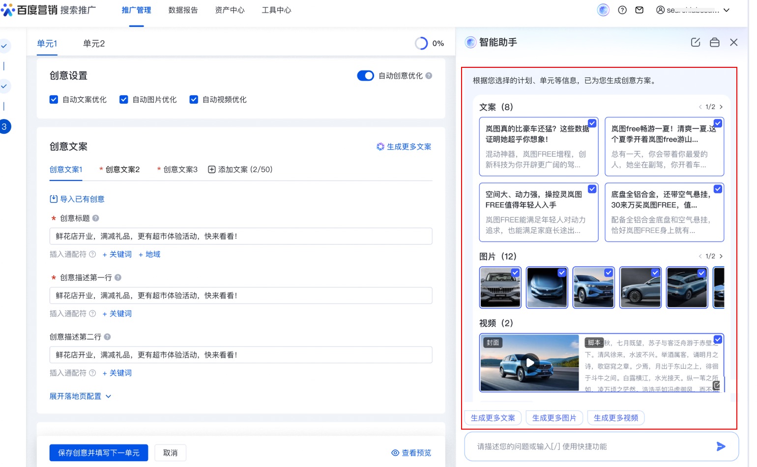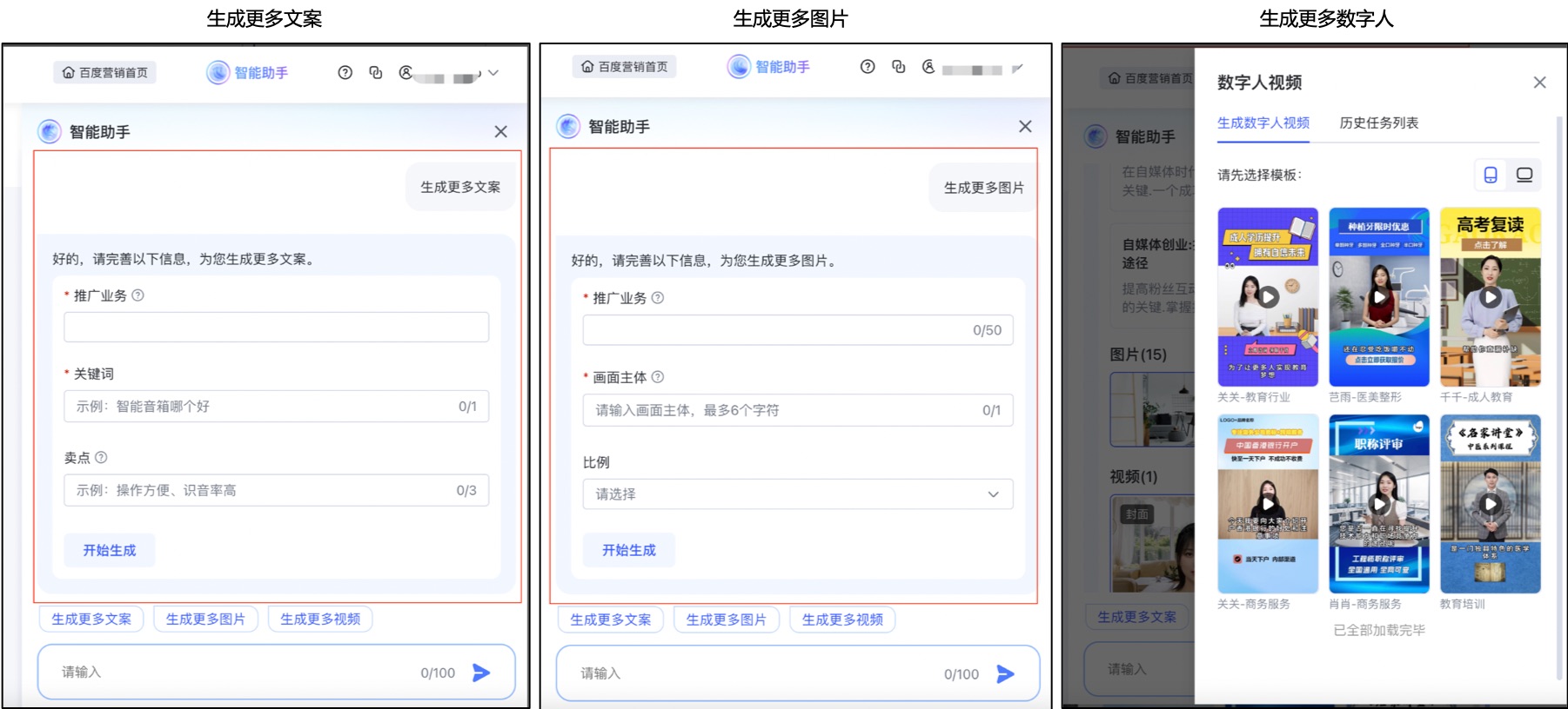 - 如無符合預期的創意方案,您還可以點擊下方的“生成更多文案、生成更多圖片、生成更多視頻”按鈕,表達推廣業務、賣點等信息,生成更多更精準的創意。
