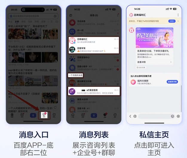 目前,消息入口已前置百度APP底部高流量位,安卓/IOS均已上線,億級流量開口,意向用戶觸手可及,助力商家搭上生意增長快車道