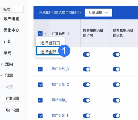 Step1:點擊推廣計劃列表頂部表頭復選框旁側箭頭----點擊「選擇全部」按鈕