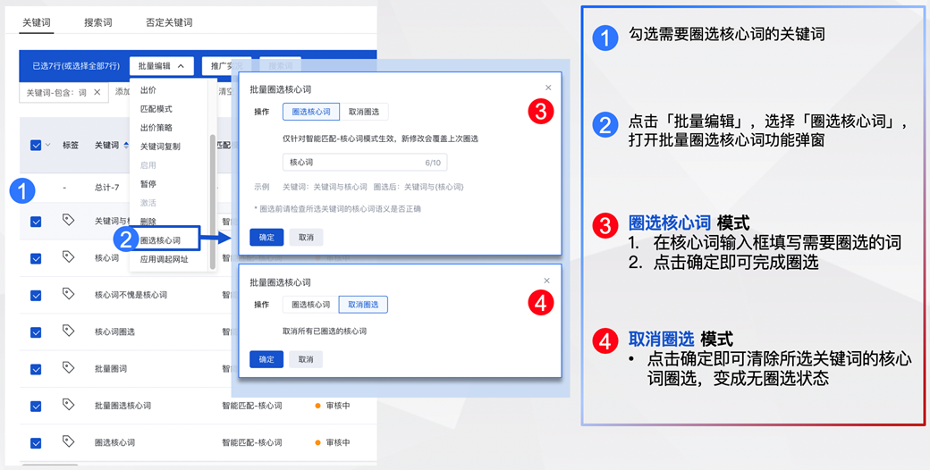 勾選關鍵詞,點擊「批量編輯」,選擇「圈選核心詞」觸發二次確認場景,自動彈出二次確認彈窗