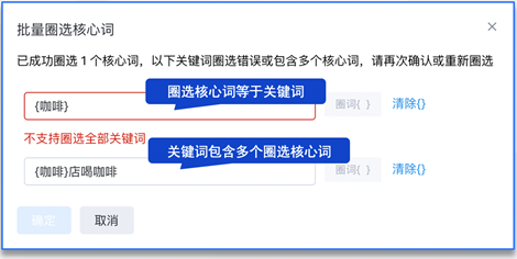 原因一:關鍵詞“咖啡”,圈選核心詞“咖啡”,不支持圈選關鍵詞本身原因二:關鍵詞“咖啡店喝咖啡”,圈選核心詞“咖啡”,關鍵詞包含多個圈選核心詞,需要再次確認