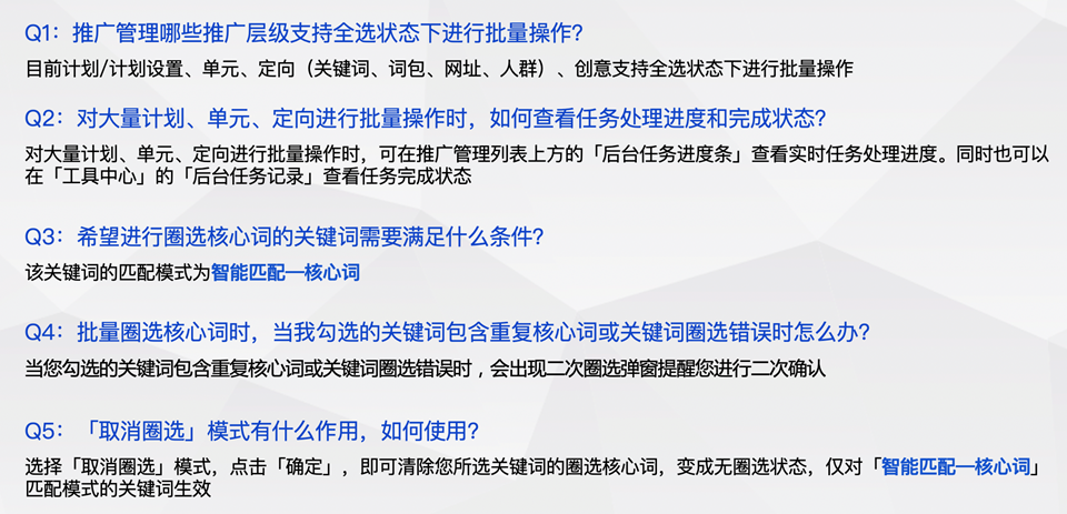 1. 支持全選計劃、單元或定向(關鍵詞、人群、網址、詞包)進行批量操作,提升批量能力;