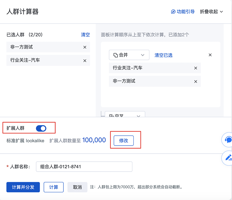 ü 擴(kuò)展人群包上限為7000萬,超出部分系統(tǒng)會自動截?cái)?,建議縮小條件范圍,控制人群包大小。