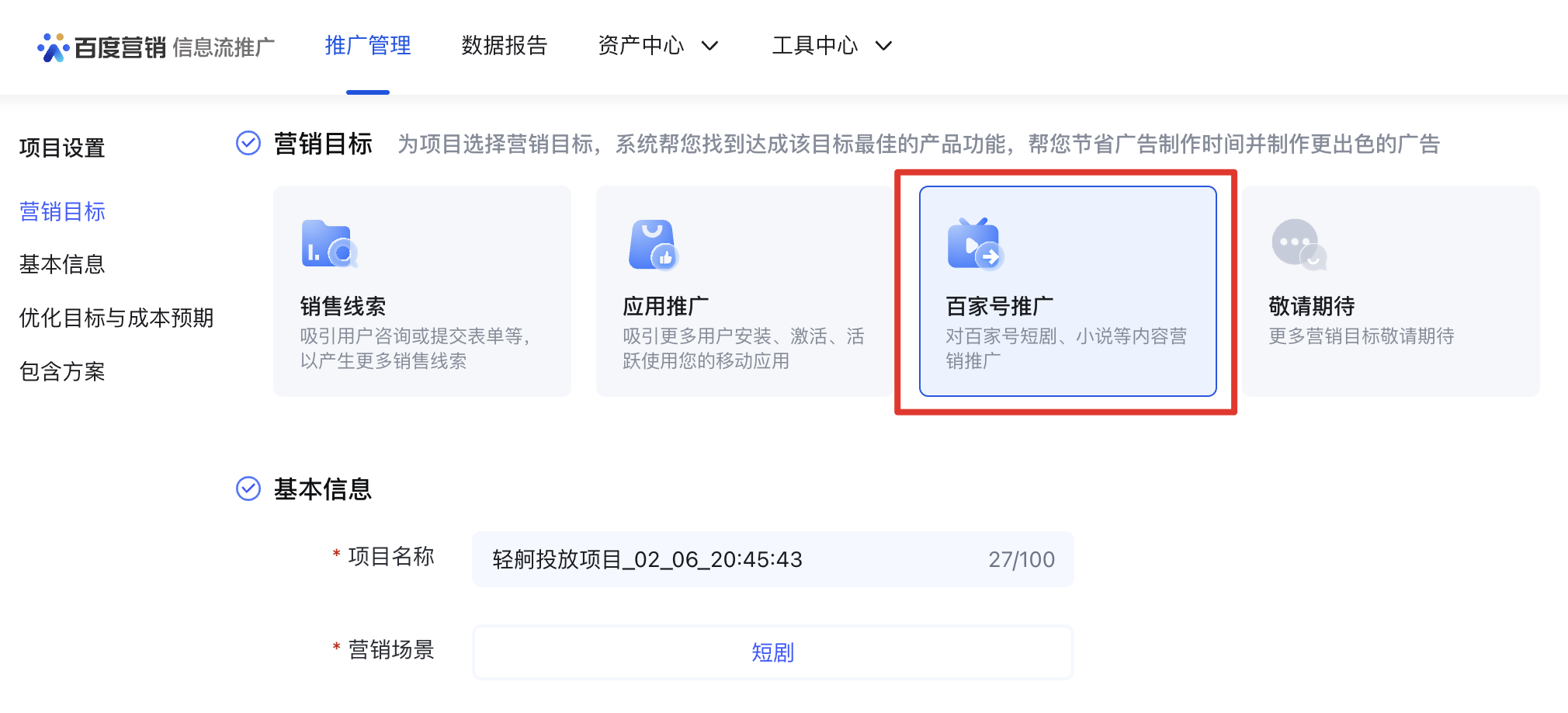 百家號推廣營銷目標新增「小說」專屬投放路徑